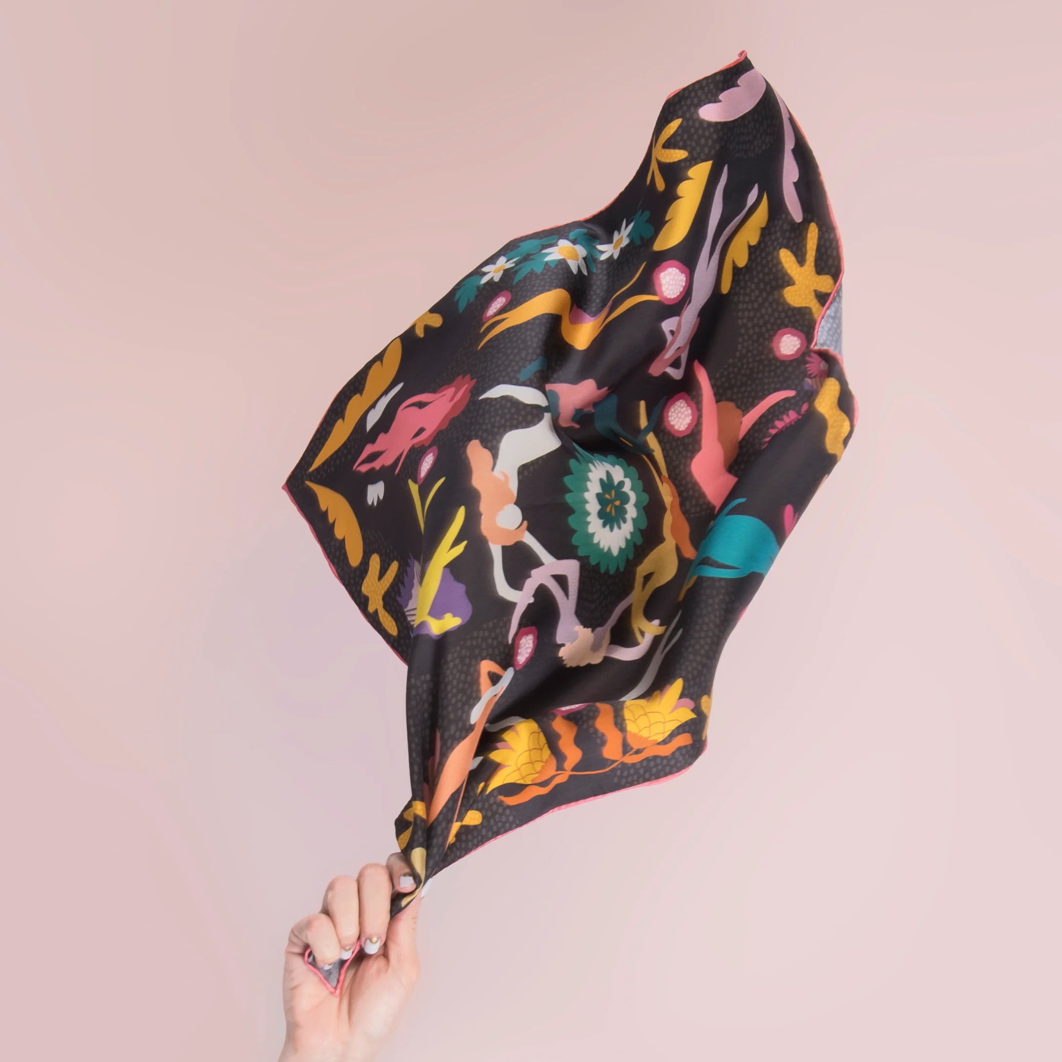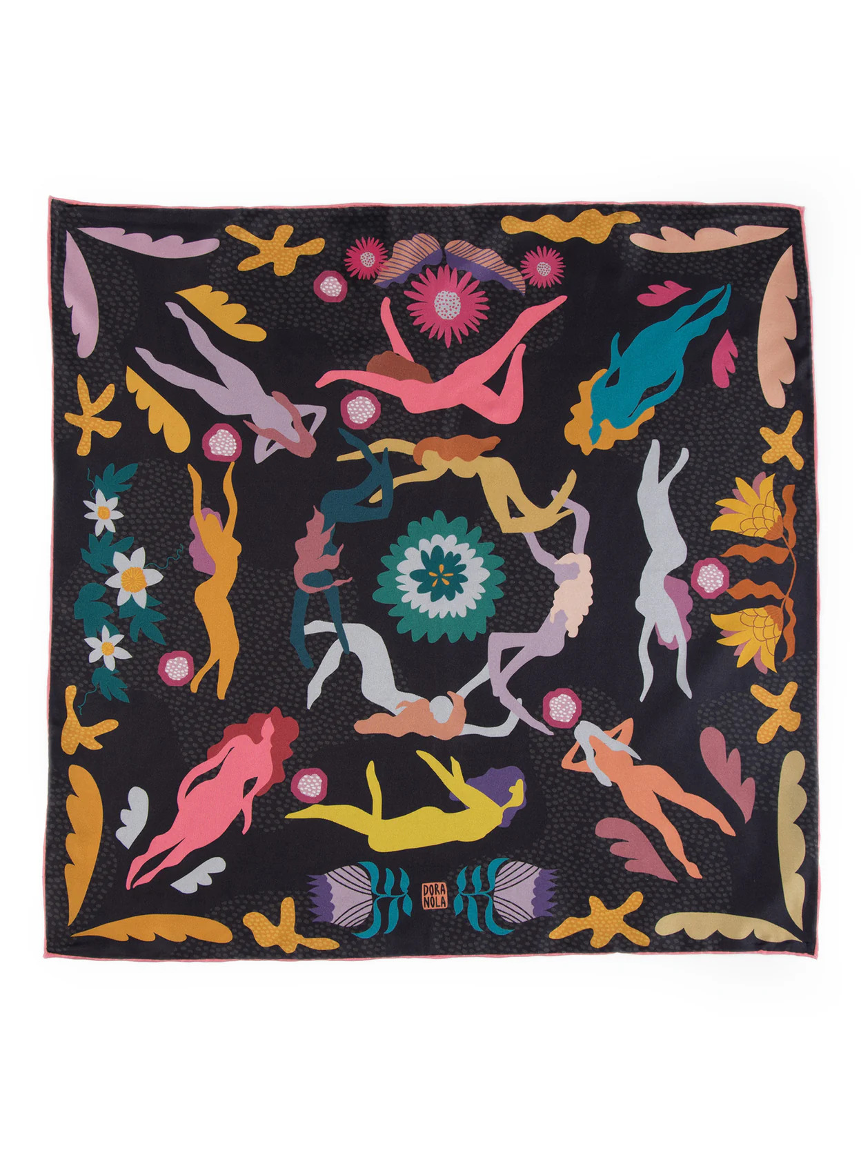 We go through life accumulating stories to tell when we're older. This design represents the journey and the wonder of life! Colourful dancers and swimmers on a rich, deep grey with pops of colour, the perfect accessory to wear with any outfit. Crafted from 100% silk twill with a pink edge… a fine detail that makes all the difference!