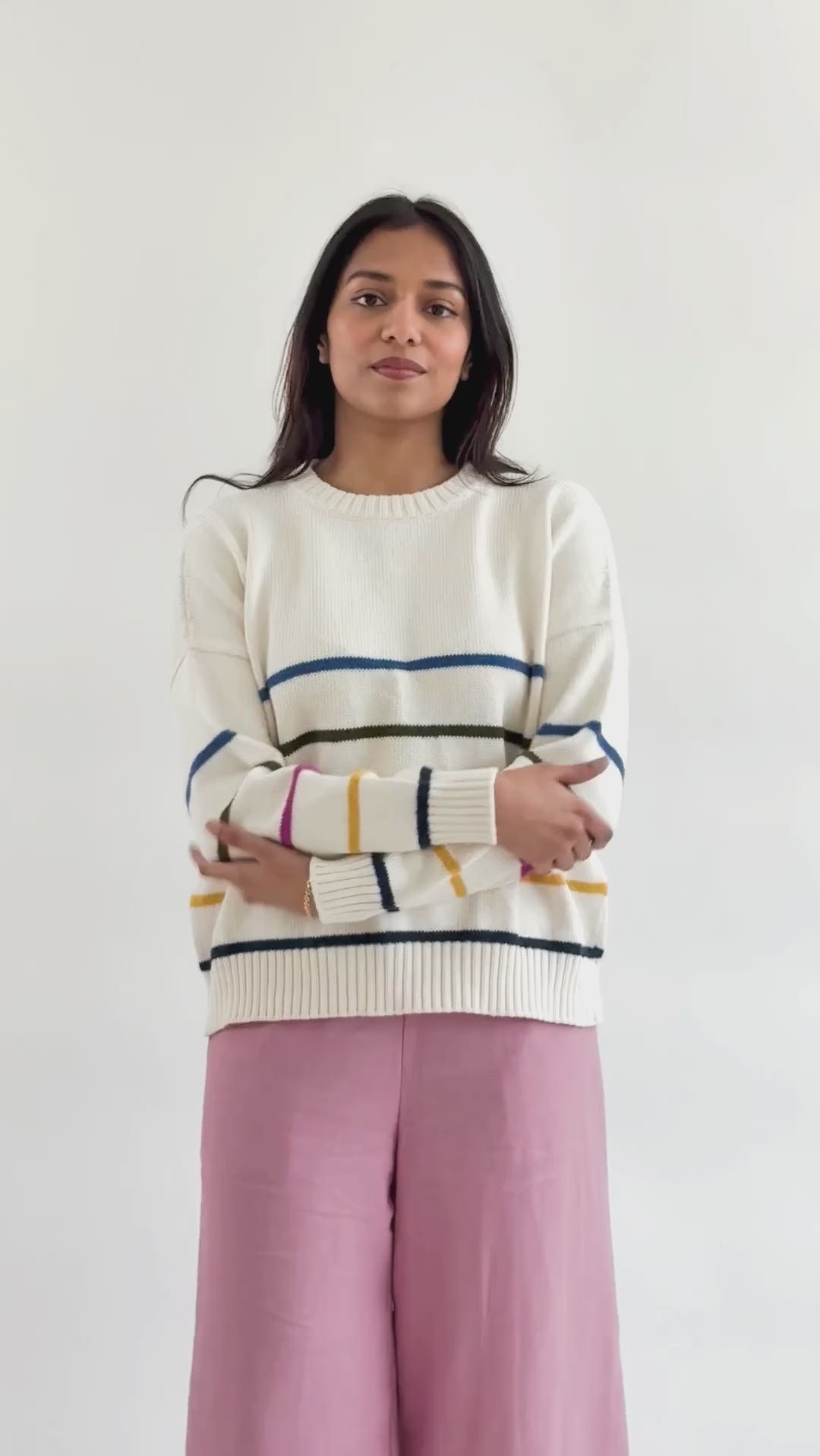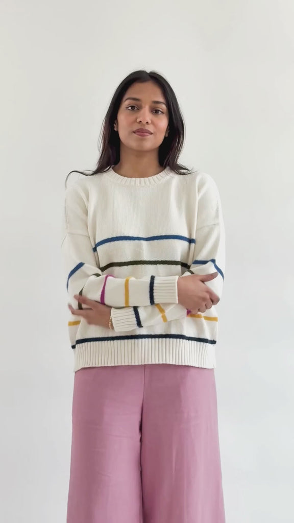 A note from Sarah: This sweater has been on my mind for quite some time. A proven body style we've done before with a cheery update. It makes a statement but is still easy to wear. Inspried by a few of my favorite friends. Who wouldn't want to wear a rainbow?
